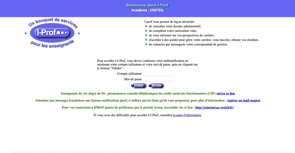 Créé en 2003, IProf est l’unique outil d’information et de gestion administrative élaboré par pour les enseignants responsables d’éducation et d’orientation au sein du ministère de l’éducation nationale. Sachant qu’il y a deux catégories d’enseignants au sein de l’académie, il y a un peu de différence d’accès :